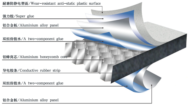 百美公司積累了二十多年防靜電地板和高架地板、機房鋁蜂窩地板、上海鋁蜂窩地板、江蘇鋁蜂窩地板、蘇州鋁蜂窩地板、無錫鋁蜂窩地板、江陰鋁蜂窩地板、常州率蜂窩地板、沈陽鋁蜂窩地板、北京鋁蜂窩地板、浙江鋁蜂窩地板、河北鋁蜂窩地板、杭州鋁蜂窩地板、溫州鋁蜂窩地板、義烏鋁蜂窩地板、安徽鋁蜂窩地板、合肥鋁蜂窩地板的生產經驗,結合鋁蜂窩板的特點,經過多次研發試驗,成功制造出了鋁蜂窩高架活動地板、鋁蜂窩架空活動地板、鋁蜂窩網絡地板、鋁蜂窩防靜電活動地板,其面板和底板采用中國鋁業(CHINALCO) 5052AH14鋁合金板,六角型鋁蜂窩芯,德國漢高(HENKEL)膠水,阿貝特(ABET)防靜電裝飾面等優質原材料。其特點:重量輕節約大樓建造成本,環保全鋁結構可100%回收,安裝效果平整美觀,均布荷載超強承重,無吸水膨脹率,隔音減震,保溫阻燃,耗散靜電強,運輸成本低,并可生產各種異形規格尺寸和大尺寸的優勢,產品常規尺寸有600×600×30mm,質量穩定,性能優異。同時也生產全鋼防靜電地板、硫酸鈣防靜電地板、木芯防靜電地板等網絡活動地板系列,高架活動地板系列,架空活動地板系列。